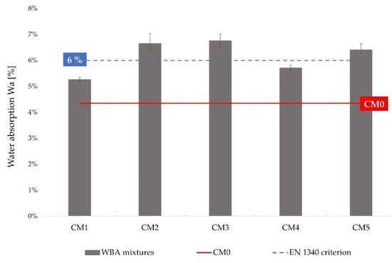 The results of testing the water absorption of concrete specimens with WBA are shown in Table 9. The water absorption is expressed as a percentage of the specimen’s own weight, which was determined as the difference between the mass of the water-saturated specimen and that of the dry specimen. It can be seen that the water absorption as a mean of all samples from the mixtures CM2, CM3, and CM5 exceeded the value prescribed by the standard EN 1340 [89], according to which no finished precast concrete element may have a water absorption over 6% by mass, with a maximum ascent of 0.8% (CM3), Figure 9. The feeble results regarding water absorption of CM2 and CM3 mixtures are in agreement with the capillary absorption outcomes, suggesting that the properties of the WBAs used (WBA 2, WBA3, and WBA5) negatively affect the structure of the cement matrix. The control mix CM0 had an average water absorption of 4.3%, which is lower than the prescribed standard value. Although the incorporation of WBAs may have a negative effect on the water absorption of cement composites as the results exceed the maximum allowable value, it is also evident that the predominant factor is the WBA type.