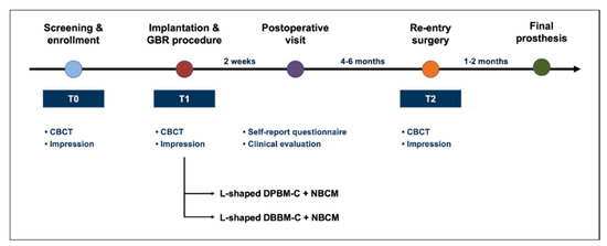 Schematic presentation of the treatment protocol and time points. CBCT sagittal cone-beam computed tomography; DBBM-C, demineralized bovine bone mineral with 10% collagen; DPBM-C, demineralized porcine bone mineral with 10% collagen; GBR, guided bone regeneration; NBCM, absorbable native bilayer collagen membrane.