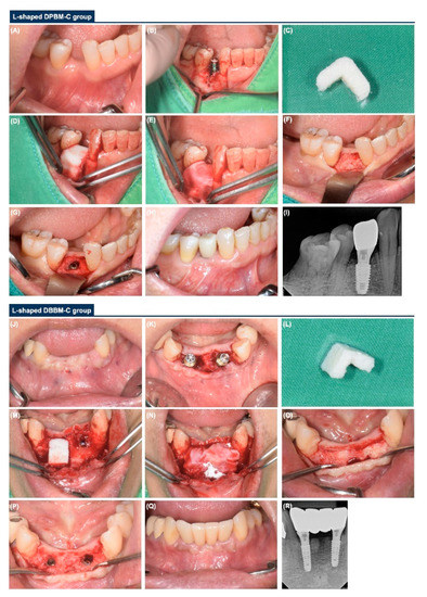 Therefore, our study aimed to determine if GBR with an L-shaped DPBM-C with a resorbable collagen membrane differs from GBR with an L-shaped DBBM-C based on the clinical, radiographic, and volumetric outcomes for peri-implant dehiscence defects.