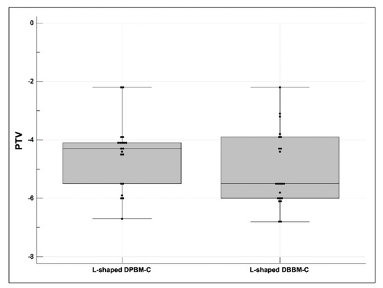 The mean PTVs showed statistically significant differences between the L-shaped DPBM-C (−4.52 ± 1.16, median −4.30 (first and third quartiles −5.50; −4.10)) and DBBM-C (−5.19 ± 1.22, median −5.50 (first and third quartiles −6.00; −4.15)) groups (p < 0.05). The box and whisker plots are shown in Figure 5.