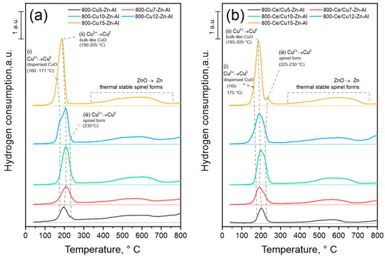 | 800-Ce/Cux-Zn-Al | CuO, (Cu,Zn)Al2O4, ZnO, CeO2 | 165–175 (D) 185–205 (B) 225–230 (S) | 12–18 |