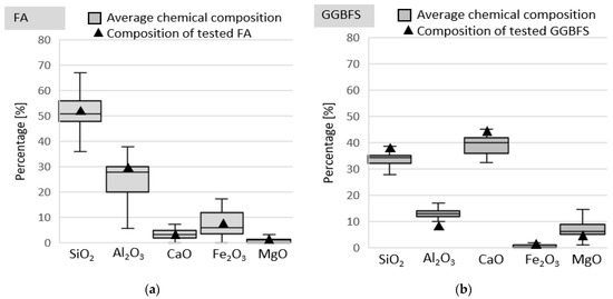 Comparison between the oxide compositions of tested precursors and the average values derived from reviewed studies: (a) fly ash and (b) ground granulated blast-furnace slag.