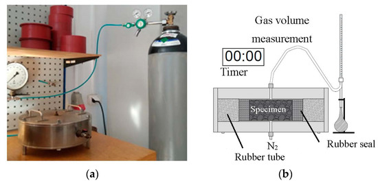 The gas permeability of the AA mortars was determined by the RILEM–Cembureau method [23]. In accordance with tests described in the literature [7,13], permeability tests were performed under a lower inlet valve gas pressure (0.5, 1.0 and 2.0 MPa) than the Cembureau recommendation. The general principle is to apply a gas (N2) under a predefined pressure to a sample with a specific cross-sectional area and measure the flow rate (the time and volume of gas that passes through the sample) if the gas flow is stable. In the permeability cell, the sample is surrounded by a rubber tube with a minimum lateral pressure of 7 bar, ensuring gas flow only through the sample. The set-up is presented in Figure 2.