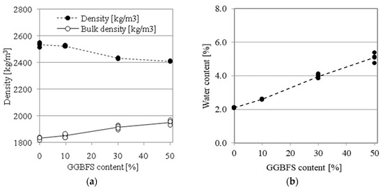 The effect of GGBFS content on the physical properties of AA mortars: (a) density; (b) initial water content.