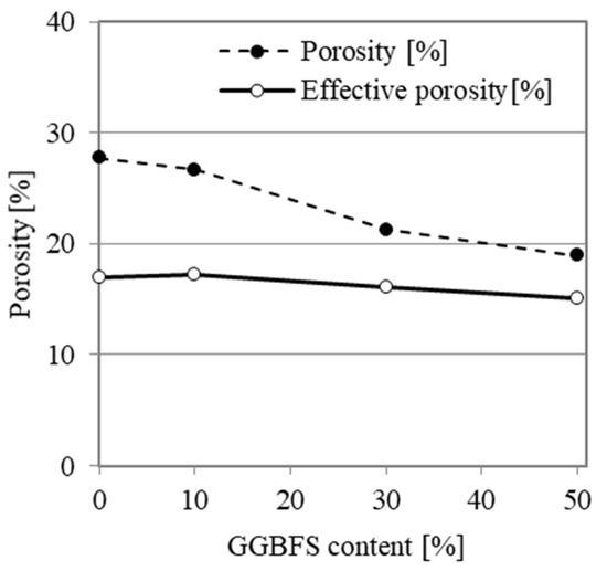 - The addition of GGBFS reduces total porosity and, to a lesser extent, effective porosity (defined as the volume of pores that are available for water saturation);