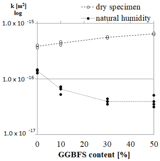 The gas permeability coefficient of AA mortars is depicted in Figure 7. The permeability measurements were performed on specimens stored in ambient conditions, in which the pores were partially filled with water (natural moisture content). The obtained results indicate a lower gas permeability with increasing GGBFS content. The average value of the permeability coefficient for AAM0 and AAM50 was 1.40 × 10−16 m2 and 3.92 × 10−17 m2, respectively. However, when the drying at 105 °C was applied, the values of permeability were not significantly different between the materials. Drying can be considered as a sort of heat treatment that may modify the porous structure, especially in cementitious materials where dehydration may occur. Although it is questionable but this drying procedure of mineral materials samples drying is frequently used when permeability of the material is evaluated with Cembureau method. The similar values of permeability of AAM after drying can be explained by the fact that the elevated temperature triggered a polymerization process that is more pronounced for the blends with lower GGBFS contents, AAM0 and AAM10. This effect was confirmed by research conducted by the authors in [4]. A temperature-induced process resulted in material densification and strength increase [4] in this research; the consequence was the permeability decrease for mortars with lower GGBFS content.