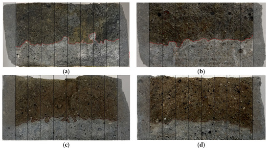 Specimens split for chloride penetration depth measurement after 6 h at 10 V: (a) AAM0 xd = 26.80 mm; (b) AAM10 xd = 25.03 mm; (c) AAM30 xd = 17.75 mm; (d) AAM50 xd = 13.46 mm.
