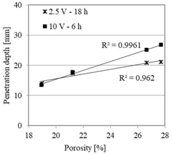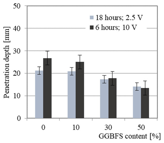 The average chloride penetration depths for AA mortars are presented in Figure 10. As a general rule, increasing the GGBFS content results in lower chloride penetration. It is worth noting that the high electrical conductivity of geopolymers required the measurements to be performed at 10 V for 6 h. This test resulted in the following penetration depths: 26.80 mm, 25.03 mm, 17.75 mm and 13.46 mm for AAM0, AAM10, AAM30 and AAM50, respectively. For the 18-h test at 2.5 V, the results confirm the trend of decreasing chloride penetration depth with increasing GGBFS content. The material performances are closely related to porosity. The almost linear relationship between the penetration depth and porosity was found and is presented in Figure 11. Moreover, the addition at least 30% GGBFS to the mortar mixture results in consistently similar values for both tests, regardless of the conditions.