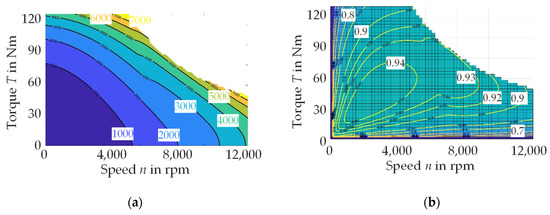 Torque–speed characteristics for a small vehicle: (a) loss map in W; (b) efficiency map.