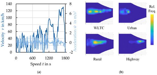 (a) Exemplary time–speed map; (b) exemplary probability of operation points for different driving cycles in a torque–speed map (WLTC: worldwide harmonized light vehicles test procedure).