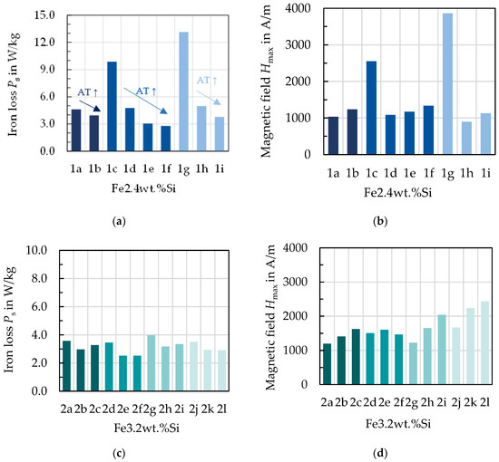 Magnetic properties of the studied material grades at 1.5 T and 50 Hz, with the same color indicating that only annealing temperature (AT) as highlighted in (a) has changed for these states: (a) loss for Fe–2.4 wt % Si; (b) magnetization for Fe–2.4 wt % Si; (c) loss for the Fe–3.2 wt % Si; (d) magnetization for Fe–3.2 wt % Si.
