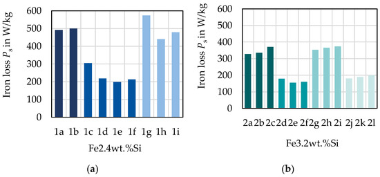 Iron loss at 1000 Hz for all studied 21 materials at 1.5 T: (a) Fe 2.4 wt % Si; (b) Fe 3.2 wt % sSi.