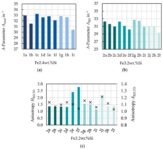 Evaluation of the A-parameter and magnetization behavior: (a) mean A-parameter for Fe–2.4 wt % Si; (b) mean A-parameter for Fe–3.2 wt % Si; (c) magnetic field at 1.0 T, 50 Hz with bars representing maximum magnetic field strength and × symbols representing A-parameters.