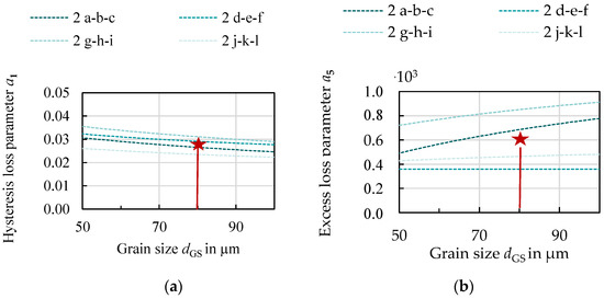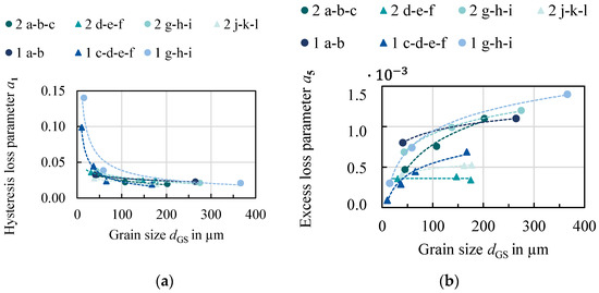 The loss parameters for all studied samples were identified as well as evaluated and are discussed in the following section. The electric resistivity can be calculated or taken from diagrams according to [19] or [20] based on the silicon and aluminum content. As the relation between the Foucault loss, the silicon and aluminum content and the sheet thickness are solely calculated, the correlations of are not displayed. In Figure 8, the hysteresis and excess loss parameters are displayed as a function of grain size. The circular markers represent the 0.5 mm grades and the triangular markers indicate the 0.25 mm grades.