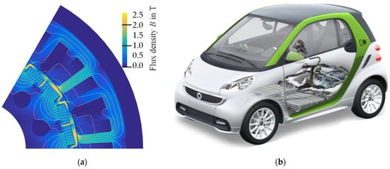 (a) One exemplary flux solution of the studied PMSM; (b) vehicle in which the studied PMSM is used.