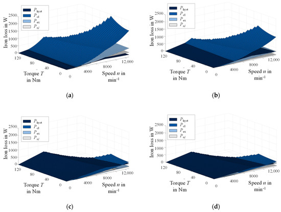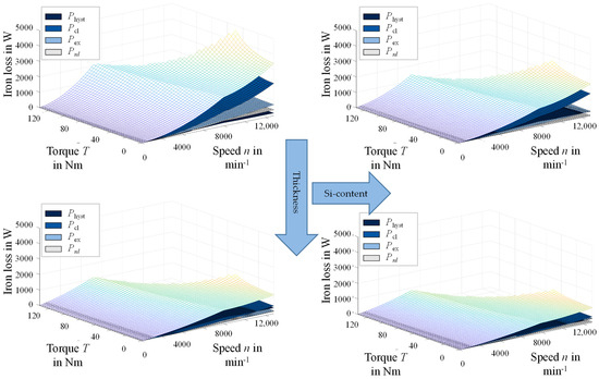 In Figure 11, the iron loss is shown as a function of the torque–speed characteristic for the four materials. Figure 11a,b shows the results for 0.5 mm steel of both alloys. Figure 11c,d shows results for the 0.25 mm steel. On the left side of Figure 11, the materials with the Fe–2.4 wt % Si are displayed (Figure 11a,c), whereas the Fe–3.2 wt % Si are displayed on the right side (Figure 11b,d). The results show that the different processing and resulting materials have a significant effect on the total iron loss over the entire torque–speed map. The slope in the low-speed high-torque area, the field weakening region and maximum torque or speed are different for each material. A general trend towards a decrease of iron loss with decreasing thickness and increasing silicon content, as highlighted in Figure 11, can be observed. A detailed look at the loss component distribution allows further insight to the previously discussed correlations with material parameters.
