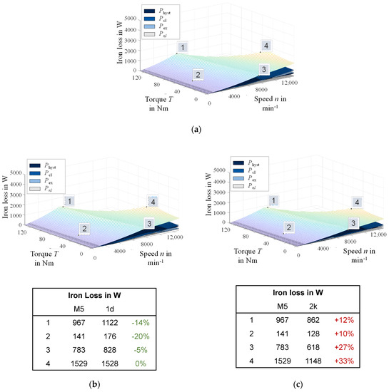 Simulation study results and comparison of the tailor-made material (M5) with two 0.25 mm steel grades in a torque–speed map: (a) Tailor-made material, Fe–3.2 wt % Si, 0.3 mm, 80 µm; (b) 1d—Fe–2.4 wt % Si, 0.25 mm, 37 µm; (c) 2k—Fe–3.2 wt % Si, 0.25 mm, 162 µm.