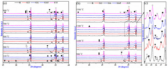 XRD patterns of Al2O3-CaO-Cr2O3 castables, (a) 110–900 °C, (b) 900–1500 oC, (c) 1300 °C. ○—Corundum (Al2O3), ■—(Al1−x,Crx)2O3 solid solution, □—Eskolaite (Cr2O3), ☆—CaCrO4, ▍—Hauyne (Ca4Al6CrO16), ▽—CA6 (CaAl12O19), ♥—NaAl11O17, ♣—C3AH6 (Ca3Al2(OH)12).