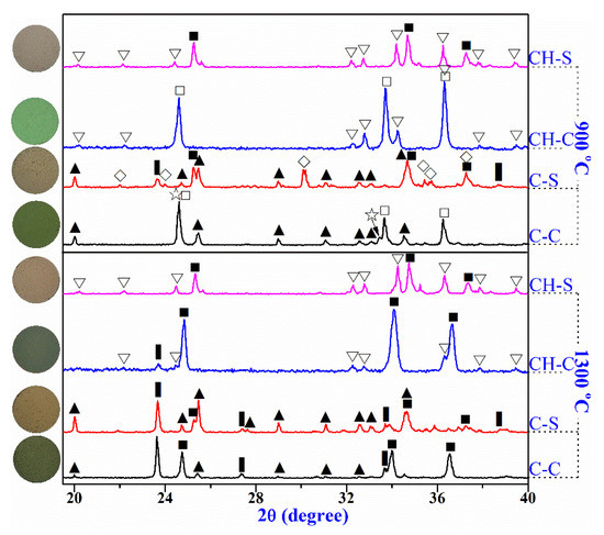 XRD pattern and corresponding images of cylindrical specimens heated at 900 °C and 1300 °C. ■—(Al1−x,Crx)2O3 solid solution. □—Eskolaite (Cr2O3), ☆—CaCrO4, ▍—Hauyne (Ca4Al6CrO16), ▲—CA2 (CaAl4O7), ◇—CA (CaAl2O4), ▽—CA6 (CaAl12O19).
