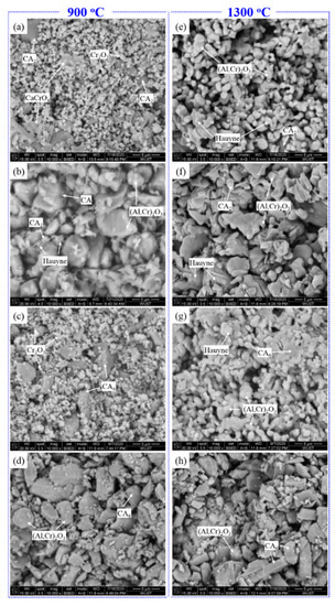 After being treated at 900 °C, the CA phase disappeared in specimen C-C with the formation of many granular CaCrO4 grains (Figure 5a) via reaction 1. However, the sample C-S was still composed of the initial main phases (CA, CA2, and (Al1−xCrx)2O3) (Figure 5b) in addition to forming minute amounts of Ca4Al6CrO16 (reaction 2). As the heat treatment temperature increased to 1300 °C, plenty of chrome-hauyne and (Al1−xCrx)2O3 solid solution (Figure 5e) were generated in specimen C-C (via reactions 3–5), accompanied by the disappearance of CA and significant reduction in CA2 phase, while specimen C-S possessed relative lower peak intensity of Ca4Al6CrO16 although it had similar phases as C-C. Combining the observations of Cr(VI) in Figure 2, with the phase evolution results (Figure 3 and Figure 4), it can be deduced that compared with Cr2O3, the (Al1−xCrx)2O3 solid solution was more stable that would not form CaCrO4 and could effectively hinder the Ca4Al6CrO16 formation when contacted with CAC. Therefore, the substitution of Cr2O3 with (Al1−xCrx)2O3 can effectively lower the Cr(VI) concentration of the castables after being treated at various temperatures (Figure 2). Furthermore, the castables with (Al1−xCrx)2O3 pre-synthesized at higher temperature exhibited lower Cr(VI) concentration, implying that the stability of the (Al1−xCrx)2O3 improved gradually with the Al2O3 proportion in the solid solution. In addition, in comparison with the CA2 phase, CA was more likely to react with Cr2O3/(Al1−xCrx)2O3 resulting in the formation of Cr(VI) compounds.
