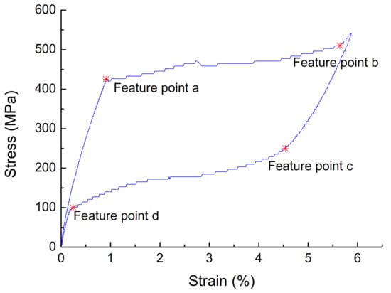The stress of four points (σa, σb, σc, σd) is used to replace the critical stress of SMA transformation, as shown in Figure 1. The starting point of the stress–strain curve platform of the loading section is taken as point a. The point where the slope of the loading section curve is significantly increased after the loading platform is taken as point b. The point where the stress–strain drops start to deviate from the linear relation is taken as point c. The point where the stress and strain begin to decrease at the end is taken as point d. Substituting the above-mentioned points for the phase transition critical point of austenite SMA, although there is a certain error between the characteristic point stress and the true phase transition stress of SMA, the phase transition process of SMA can still be reflected.