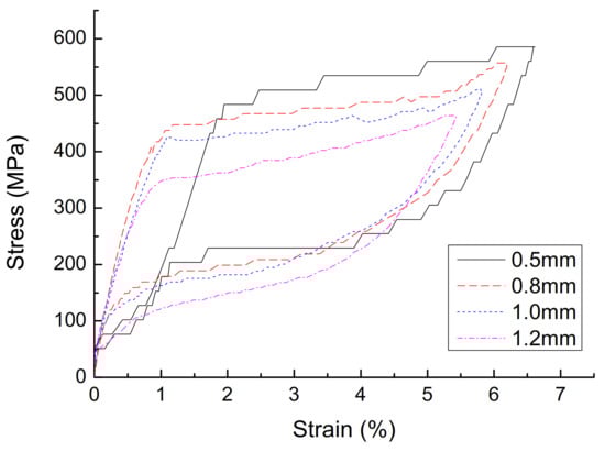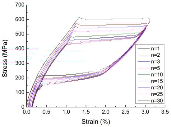 - The effect of cyclic loading on the mechanical properties of superelasticity. The stress–strain curve with a diameter of 1.0 mm, a loading rate of 10 mm/min, and a strain amplitude of 3% is shown in Figure 2, and the parameters are shown in Table 1. It can be seen that, with the increase of the number of cycles, the cumulative residual deformation of the austenitic SMA wire gradually increases, but the residual deformation of the single cycle gradually becomes smaller, and stabilizes after 15 cycles, and the residual strain is zero. With the increase in the number of cycles of loading, the performance of austenitic SMA wire gradually stabilizes, the stress–strain curve gradually becomes smooth, the energy dissipation capacity and equivalent damping ratio of the SMA wire gradually decrease, and the equivalent secant stiffness slightly decreased, but stabilized after 15 loading/unloading cycles. The number of cycles has a great influence on the mechanical properties of austenitic SMA wire. In actual engineering applications, in order to obtain stable superelastic properties, the SMA wire must be cyclically loaded in advance, and it usually takes about 20 cycles.