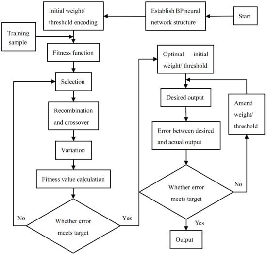 Flow chart of BP network optimized by genetic algorithm.