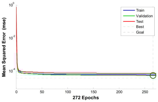 The first step is to create a BP neural network model of austenite SMA, and a BP neural network model optimized by GA. MATLAB2013b neural network toolbox and gatbx toolbox are used to write simulation program code. The data of the last cycle of the test condition are used as the training sample of BP neural network. The training function is selected as trainlm, the maximum number of training times is 1000, the target error is 10−5, and the learning rate is 0.1. The topological structure of BP neural network can be obtained by running the program as shown in Figure 7, and the validation performance chart is shown in Figure 8.