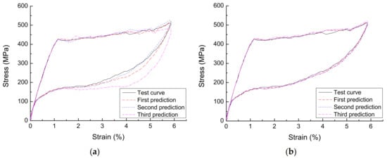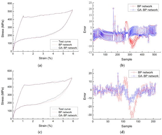 Figure 9 is a comparison diagram of the BP neural network prediction curve and the experimental curve at the diameter of 1.0 mm, loading rate of 90 mm/min, and strain amplitude of 6%. It can be seen that, after each training, the BP neural network prediction curve without GA optimization has a large fluctuation range due to the randomness of the initial weight/threshold, but that optimized by GA is in good agreement with the test curve, avoiding the difference of the model obtained from each run of the BP neural network, and it is a constitutive model of SMA with good stability and high accuracy.