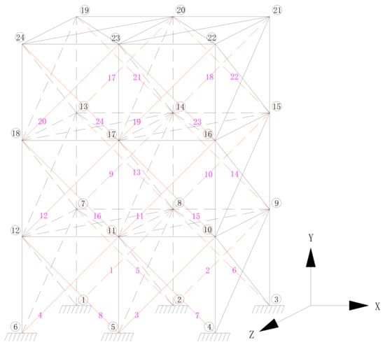 As the vertical and horizontal SMA wires in the XY plane and the SMA wires in the YZ plane have little shock absorption effect on the structure under the action of the horizontal earthquake in the X direction. The SMA wires at these positions are not considered here. Only the diagonal SMA wires in the XY plane are considered, so the node numbers of the spatial model structure and the possible positions of the SMA wires are shown in Figure 11. The positions of the red lines in the figure represent all the possible positions of the SMA wires with a total number of 24.