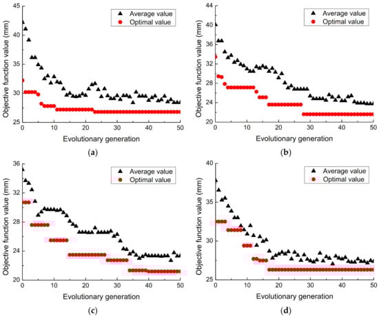 Objective function values with the change of evolutionary generations under different amounts of SMA wire, (a) 4 SMA wires, (b) 8 SMA wires, (c) 12 SMA wires, (d) 20 SMA wires.