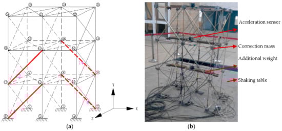 It can be seen from the optimization results that with the increase of genetic evolution generations, the optimal value of the objective function gradually decreases, and the average value of the objective function basically shows a gradually decreasing trend, which indicates that the optimal value and the average value are in a gradual convergence. During the process, the value of the objective function changes less and less. The optimized arrangement of the SMA wire has a better suppression effect on the seismic response of the space structure, but it is not that the more the number of SMA wires installed, the better the shock absorption effect. When the number of the SMA wire exceeds a certain number, the shock absorption effect decreases. When 4 austenitic SMA wires are arranged, the SMA wire layout optimized by GA can reduce the storey drift of the structure by 44.51%. Therefore, for the consideration of damping efficiency and economy, 4 SMA wires are selected to passively control the structure. The optimized layout is shown in Figure 13a, and the shaking table test model is shown in Figure 13b.