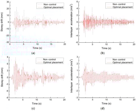 Time history curves of seismic response of spatial model structure with and without control, (a) storey drift of first floor, (b) interlayer acceleration of first floor, (c) storey drift of third floor, (d) interlayer acceleration of third floor.