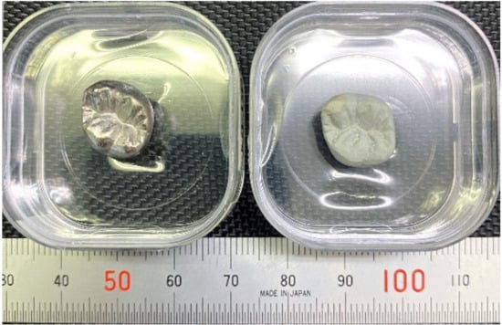 Based on previous reports [,], Ti–29Nb–13Ta–4.6Zr and Ti–36Nb–2Ta–3Zr–0.3O have a strong potential for use in dental prosthesis devices due to their color tone and microstructure. In addition, it has been also previously reported that the oxide layer on Ti–29Nb–13Ta–4.6Zr exhibits high exfoliation resistance []. Figure 1 shows a prototype of a titanium dental crown with/without oxidation. A smooth white oxide layer evenly coated the surface of a dental crown with complex shapes. Since such a uniform white layer was formed, fusing operations, such as a bonder and an opaque porcelain fusing operation of the metal bond porcelain crown, can be altered. This is expected to reduce the number of fusing operations.