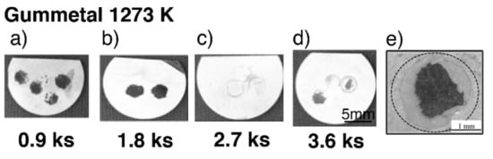 The microstructures were observed using an optical microscope (OM, BX41M-ESD, Olympus, Tokyo, Japan). Microstructure cross-sections were observed using an SEM with an energy dispersive X-ray spectroscope (SEM-EDS, JEM-7001FA, JEOL, Tokyo, Japan), a 200 kV scanning-transmission electron microscope (STEM, JEM-ARM200F, JEOL, Tokyo, Japan), and a 400 kV transmission electron microscope (TEM, JEM-2100F, JEM2010, JEOL, Tokyo, Japan) with EDS. Sample cross-sections for SEM were prepared by cutting an oxidized specimen embedded in resin perpendicular to the surface using a diamond wheel saw, and the cross-section was subsequently polished with colloidal silica. The oxide layer thickness was measured from the SEM images. TEM specimens were prepared using a focused ion beam with a microsampling function (FIB, Quanta3D, FEI, Hillsboro, OR, USA). The specimens were oxidized in an air furnace at 1273 K for 1.8 ks.