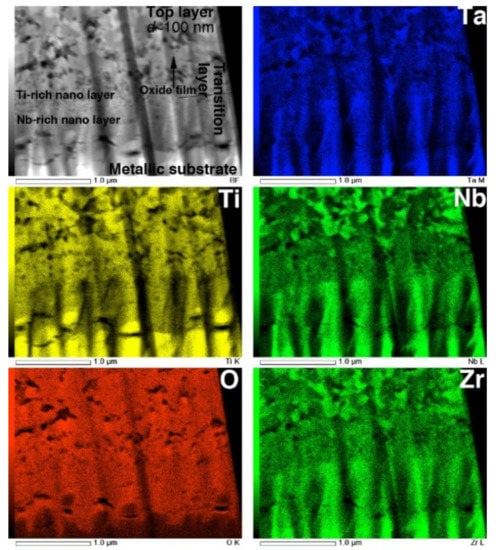 The STEM and TEM-EDS mapping images of the interface are shown in Figure 12. In the O map, the boundary dividing the high- and low-O regions is clearly observed at the interface between the metallic substrate and the transition layer. The composition maps clearly reveal that the transition layer is composed of two layers consisting of Ti- and Nb-rich nanograins. This result corresponds to the interfacial transition layer observed in EPMA maps, reported previously []. Above the transition layers, the top layer consists of multiphase equiaxed oxides with diameters of approximately 100 nm, corresponding to the image in Figure 11c.