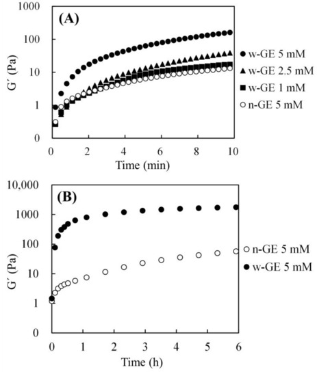 Figure 1 shows the representative gelation curves for the 0.25% CH/genipin solutions obtained by the dynamic viscoelastic measurements with the rheometer at 37 °C, exhibiting the differences of immediate crosslinking rates between w-GE and n-GE. The sharpest increases in G′ was observed for the solution containing 5 mM of w-GE immediately after the measurement initiated (i.e., immediately after CH and w-GE solutions were mixed) (Figure 1A). In contrast, the solution containing 5 mM of n-GE exhibited the slowest increase in G′, which was comparable to that of 1 mM of w-GE. The fastest gelation rate was observed in w-GE (5 mM), followed by w-GE (2.5 mM), and w-GE (1 mM), which was roughly equivalent to n-GE (5 mM).