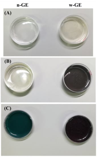 Fourier transform infrared (FTIR) spectra of w-GE and n-GE were recorded on a Bruker ALPHA II FTIR spectrometer (Bruker Optics, Billerica, MA, USA) equipped with a Platinum ATR. The w-GE and n-GE solutions were freeze-dried with a vacuum freeze drier (FDU-2110, EYELA, Tokyo, Japan) to obtain dried specimens. The spectra were recorded in the 4000 to 400 cm−1 range with a resolution of 2 cm−1.