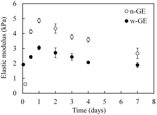 The mechanical tests for the CH/genipin gels were carried out to determine the time-dependent changes in elastic moduli of the gels over a period of 7 days (Figure 3), which is a reflection of crosslinking densities. The elastic modulus of the CH/w-GE gel increase time-dependently, reached its maximal value (3.05 kPa ± 0.14 kPa) in 1 day, and then began to decrease. Eventually, the elastic modulus leveled off at approximately 2 kPa from day 4 to day 7. The elastic modulus of the CH/n-GE was smaller than that of the CH/w-GE in the initial stage of the tests, but exceeded it at 12 h. It reached its maximal value (4.86 kPa ± 0.15 kPa) was also obtained in 1 day and was higher than that of the CH/w-GE gel. Subsequently, the elastic moduli decreased in a time-dependent manner and became 2.67 kPa ± 0.35 kPa at day 7.