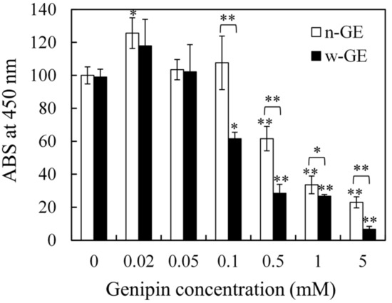 Results of acute cytotoxicity tests for w-GE and n-GE using a WST-8 assay. In this assay ABS at 450 nm reflects the numbers of viable V79 cells, which were in contact with genipin solutions for 1 h. Percent cell viability is the ratio of each ABS (genipin concentrations 0.02–5 mM) to that of the control (n-GE concentration = 0 mM). Statistical analyses were performed to evaluate statistical significances not only between various concentrations of genipins (0.02–5 mM) and the controls (without genipin) but also between w-GE and n-GE at similar concentrations. The results of the former statistical analyses are depicted over the bars. Those of the latter are depicted using brackets. *, p < 0.05; **, p < 0.01. Data are presented as mean ± SD (n = 3).