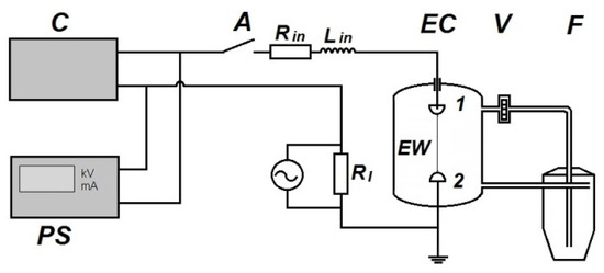 The setup works as follows. High voltage source PS (Figure 1) charges the capacitive energy storage C to the given voltage U0, the value of which is monitored with a kilovoltmeter kV. Energy storage C consists of a bank of pulse capacitors connected in parallel. After switching on the arrester A, the energy stored in C is transferred to the wire EW located between the high-voltage electrode 1 and the grounded electrode 2 in the explosion chamber EC. The current I(t) flowing through the wire is recorded using the current sensor RI. The signal from the sensor is transmitted over a coaxial cable with a characteristic impedance of 75 ohms to a digital oscilloscope. Rin and Lin are intrinsic resistance and inductance of the setup electrical circuit, respectively. The energy level input into EW for the electrical explosion is controlled by the variation of high voltage U0.