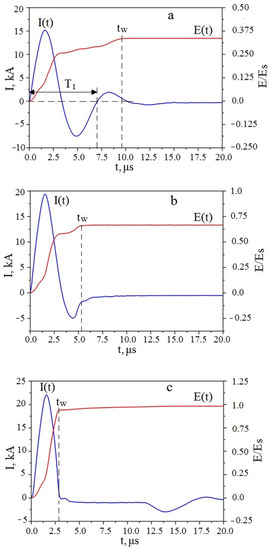 The circuit inductance L of the electric circuit was determined from the Equation (2) according results of the short circuit experiment, when the high-voltage and low-voltage electrodes were connected by a conductive bus of large section, with T being the period of the oscillatory discharge in the electric circuit.