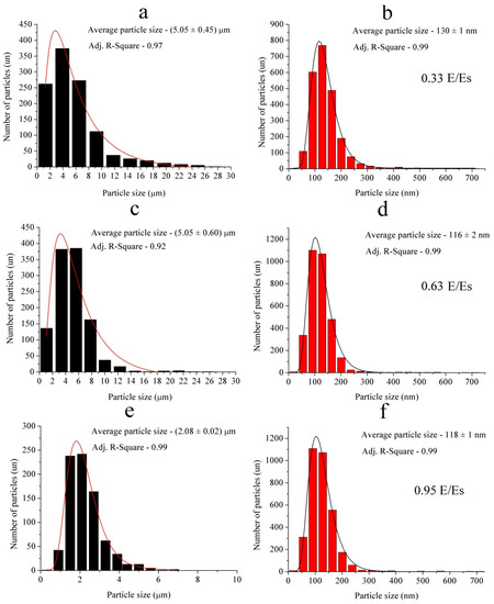With an increase in energy input to E/Es = 0.63 (Sample 2), the proportion of submicron particles and the number of particles with a size from 5 μm to 8 μm increased, while the proportion of particles with a size of more than 10 μm decreased (Figure 4b and Figure 5c). An increase in energy input up to E/Es = 0.95 (Sample 3) led to a decrease in the average size of microparticles, while there were no particles larger than 10 microns (Figure 4c and Figure 5e).