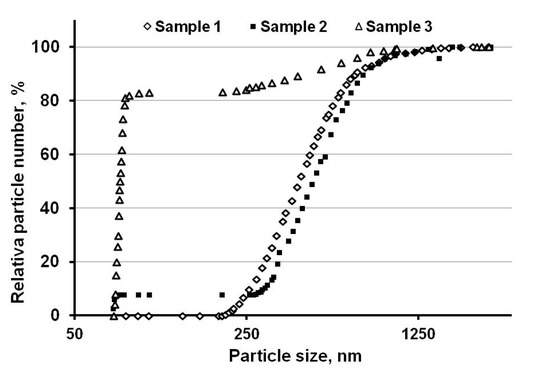 With an increase in the E/Es value, the number of nanoparticles in the sample increased; therefore, some of the nanoparticles were in a free state. In Sample 2, the proportion of such nanoparticles was about 8% of the total number of particles. In Sample 3 obtained at the maximum energy input, the number of such nanoparticles was about 82% of the total number of particles.