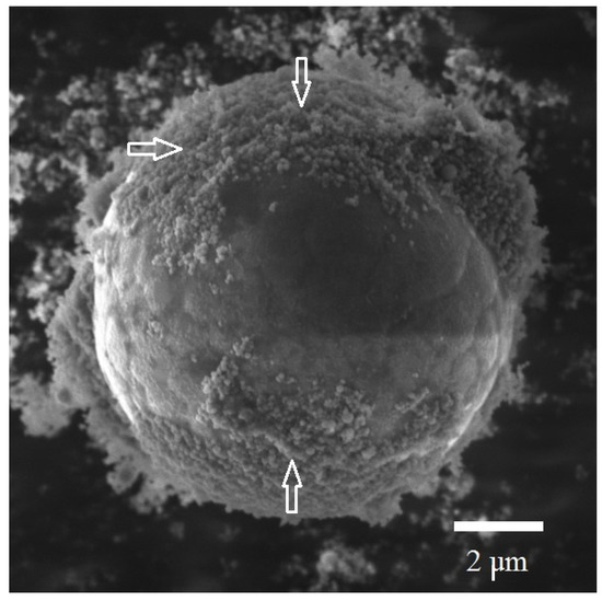 SEM image of nanoparticles and submicroparticles located on the surface of the microparticle (shown by arrows) (Sample 1).