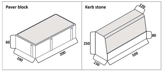 General appearance and dimensions (mm) of the paving blocks (left) and the kerbstone (right).