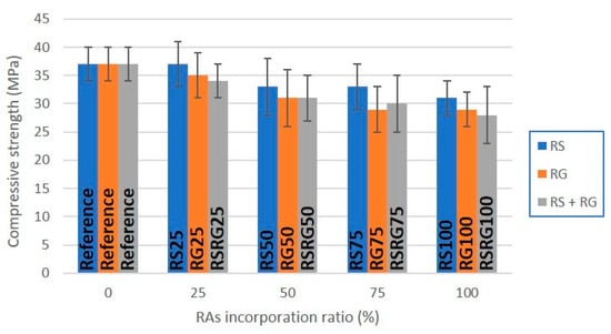 Table 3 shows several technological properties, such as water absorption (WA), apparent porosity (AP), real density (SG), and compressive strength (σ) determined in concrete test specimens manufactured with different substitutions of NAs by RAs. Similar results were obtained in other studies [,,,]. It is noted that, in general, the addition of RAs increases the WA and AP of concrete test specimens while reducing the SG and σ values.