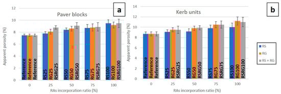 Regarding apparent porosity, Figure 4 depicts the influence on this property of partial or total replacement of NAs by RAs. As expected, similar to that observed for water absorption, apparent porosity increases with the percentage of natural aggregate that is replaced so that pavers manufactured with full substitution achieve porosity values approximately 25% higher than those from natural aggregates (Figure 4a). Concerning kerbs units (Figure 4b), the increase in apparent porosity is more dependent on RS (RS100), RG (RG100), and RS + RG (RSRG100) occurrence. However, in general, the effect of the inclusion of recycled aggregates on the increase in apparent porosity is lower than the corresponding effect on water absorption, indicating a prevalence of water absorption by hygroscopicity of the recycled aggregates as against capillary absorption through the pore system [,].