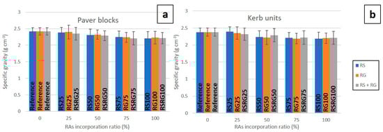 Graphical representation of specific gravity vs. RAs’ incorporation ratio in pavers (a) and kerbs (b).