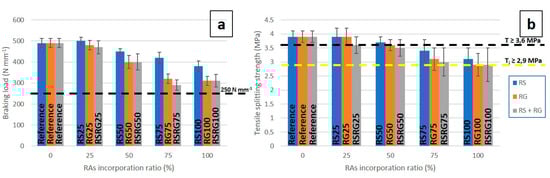 Furthermore, in line with the results of previous research [,], the strength decreased to a varying level as a result of the RAs’ content. The decrease in strength values could be explained by a worse aggregate–cement bonding due to the presence of traces of other components of the CDW adhered to the RAs’ surface. Figure 6 illustrates the results of breaking load by unit of length and tensile strength determined for conventional concrete paver blocks and for those with recycled aggregates. In all cases, prefabricated elements prepared with recycled aggregates showed values of breaking load over the minimum of 250 N mm−1 stated in the EN-1338 [] standard, achieving an average value of breaking load close to 500 N mm−1 (Figure 6a). Compared to concrete samples free of RAs, the total replacement of RS resulted in a concrete breaking load of about 22%, while the use of RG or a mixture of RS and RG reduced the concrete strength by up to 37%.